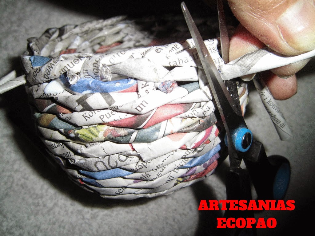 7. Hacemos el redoblaje de la cesta. (puedes hacer el que prefieras). Para el que yo hice, lleve un rollito pilar por detrás del que esta al lado y por delante del siguiente y nuevamente por detrás, sacando el rollito.